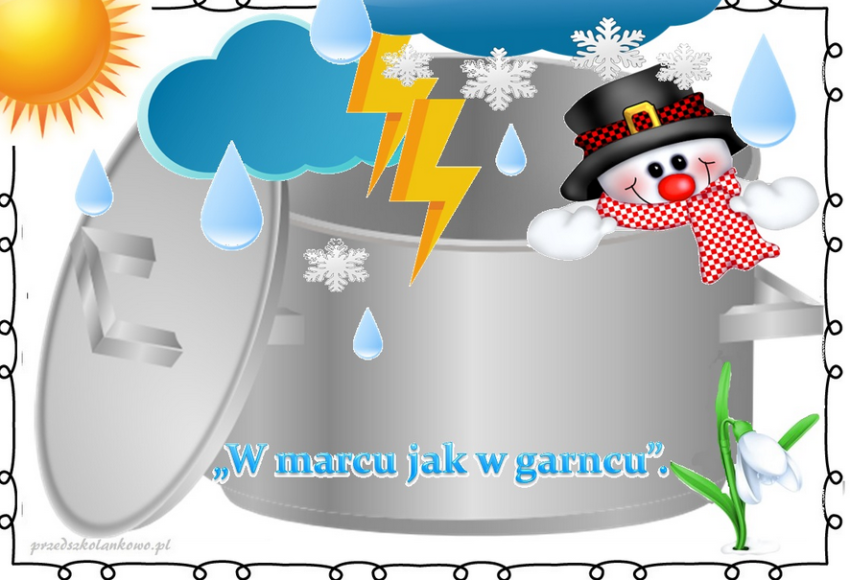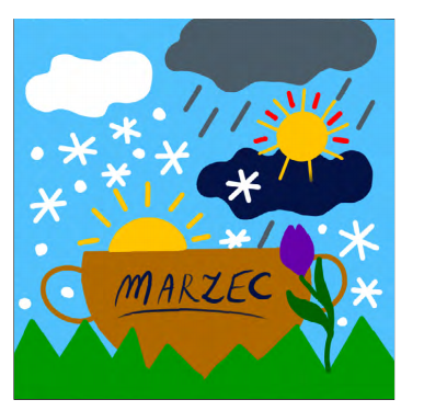 „Marcowe kaprysy”- Bożena Forma Wymieszał marzec pogodę w garze. – Ja wam tu wszystkim zaraz pokażę. Śnieg i przymozki, deszczową słotę, słońca promieni dorzucę trochę. Domieszam powiew wiatru ciepłego, smutno by w marcu było bez niego. Deszczu ze śniegiem troszeczkę dodam, będzie prawdziwa marcowa pogoda.