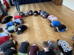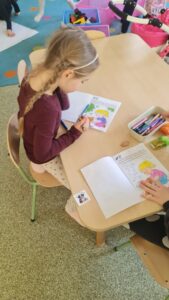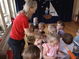 Przedszkolaki miały również okazję wziąć udział w warsztatach dotyczących bezpiecznego zachowania w sytuacjach zagrożenia. Dzieci poznały tzw. bezpieczne pozycje i dowiedziały się, jak reagować, aby zadbać o swoje bezpieczeństwo.